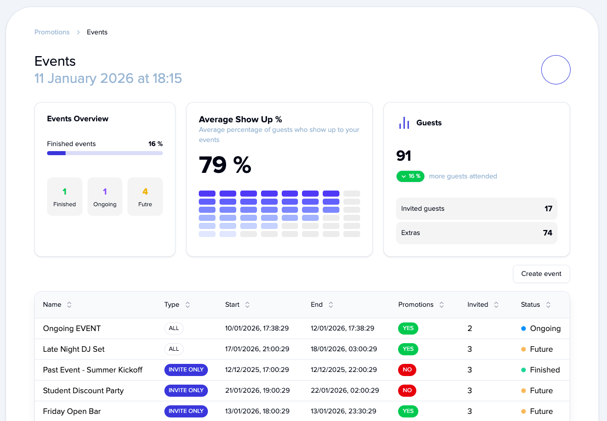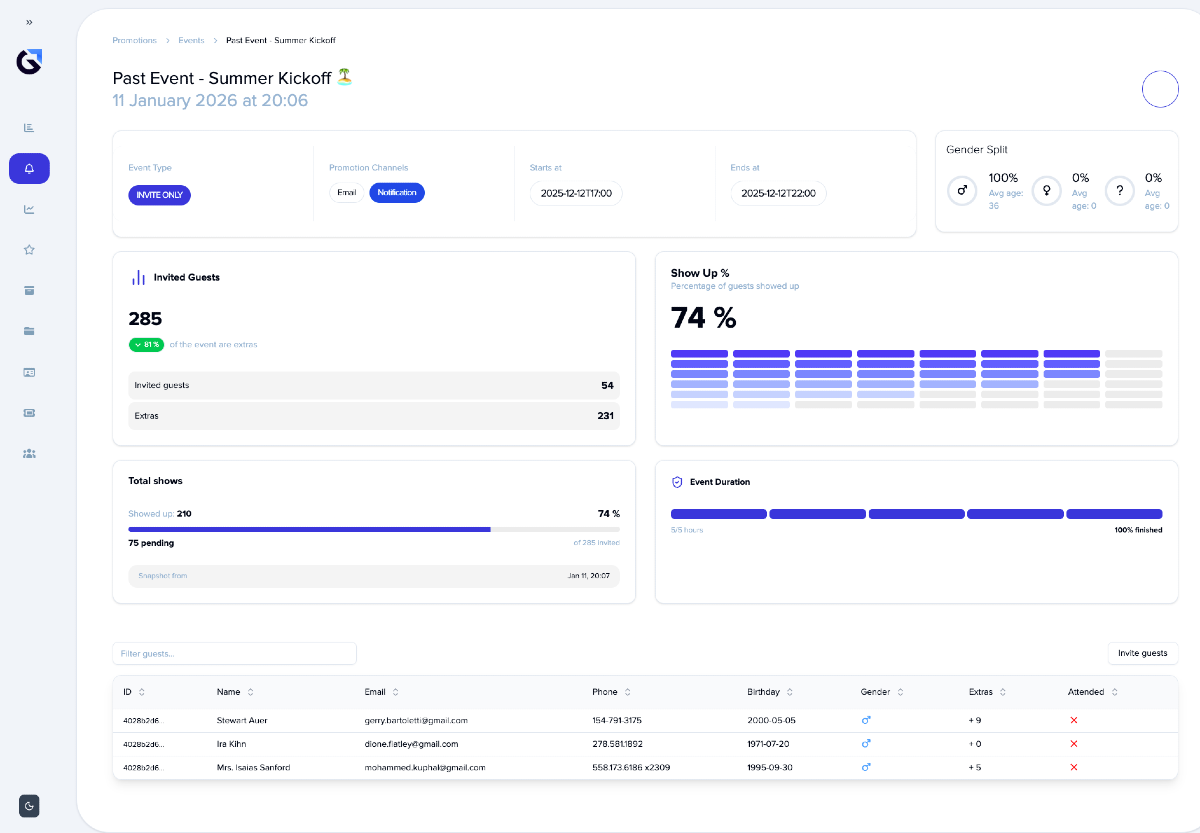 Track all your events - past, current, and upcoming. See attendance, gender and age splits, +1 participation, and real-time guest check-ins. Forecast future events, including max invited guests and extras.