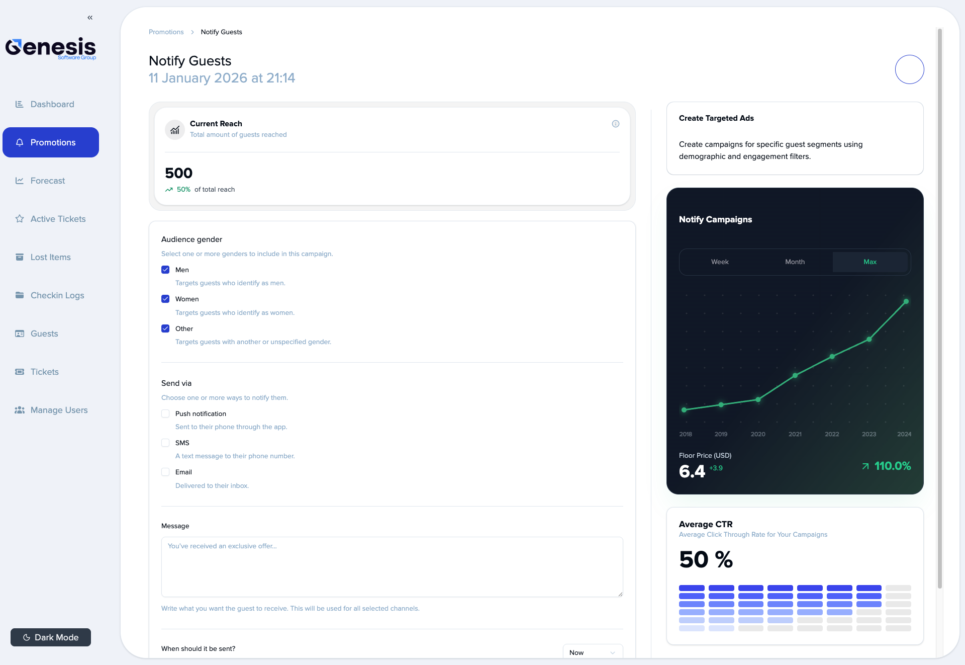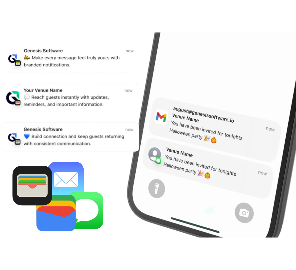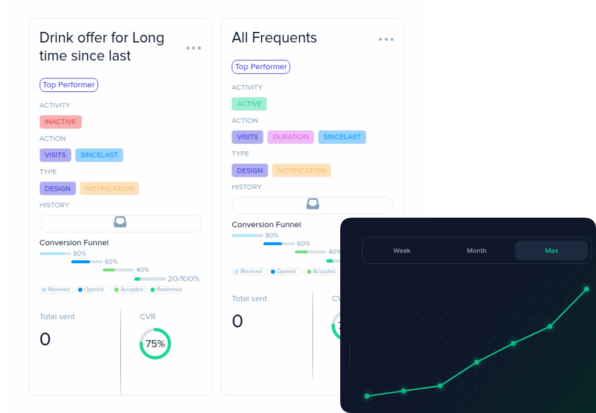 Reach your guests via wallet-notifications, email, SMS and other channels to maximize reach.